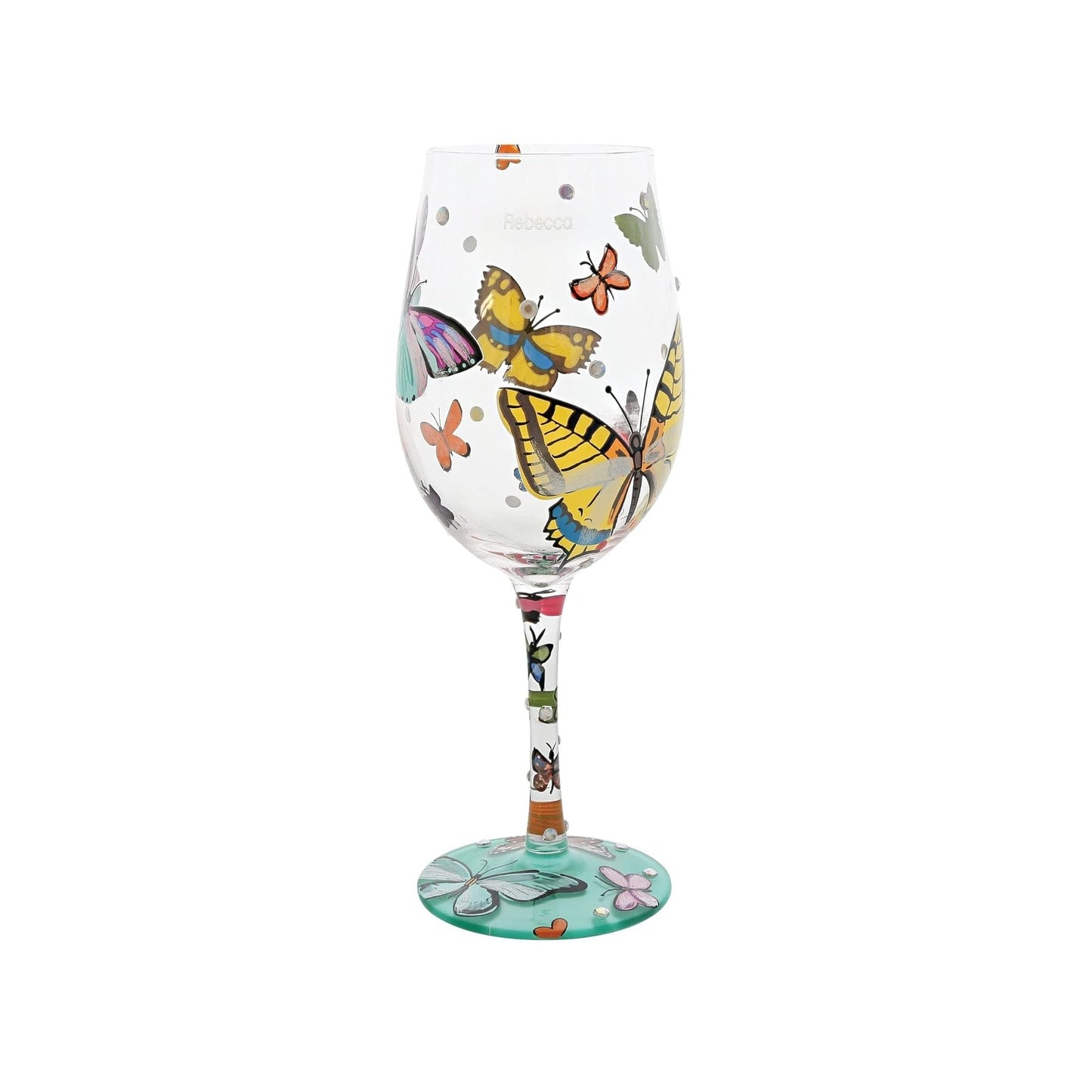 This glass has plenty of butterflys on it. All Wine Glasses come packaged in a signature gift box with a unique recipe. Every glass is mouth blown and hand painted. Hand wash only. 15 Oz. capacity