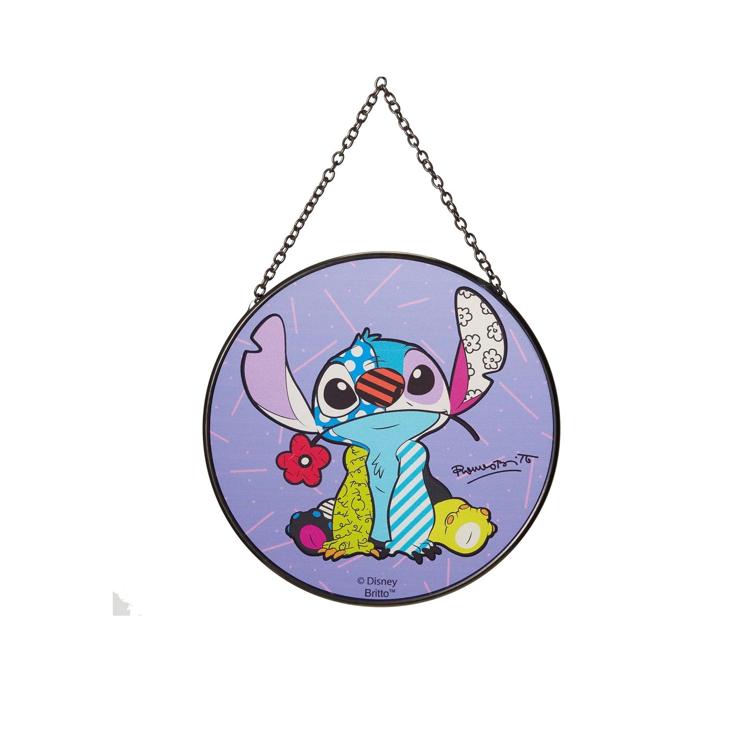 Bring a little bit of whimsy into your home and garden with pop artist Romero Britto's colorful interpretation of the one and only Stitch. Perfect to display in a window to catch the sun, or hang outside in a bright sunny spot.