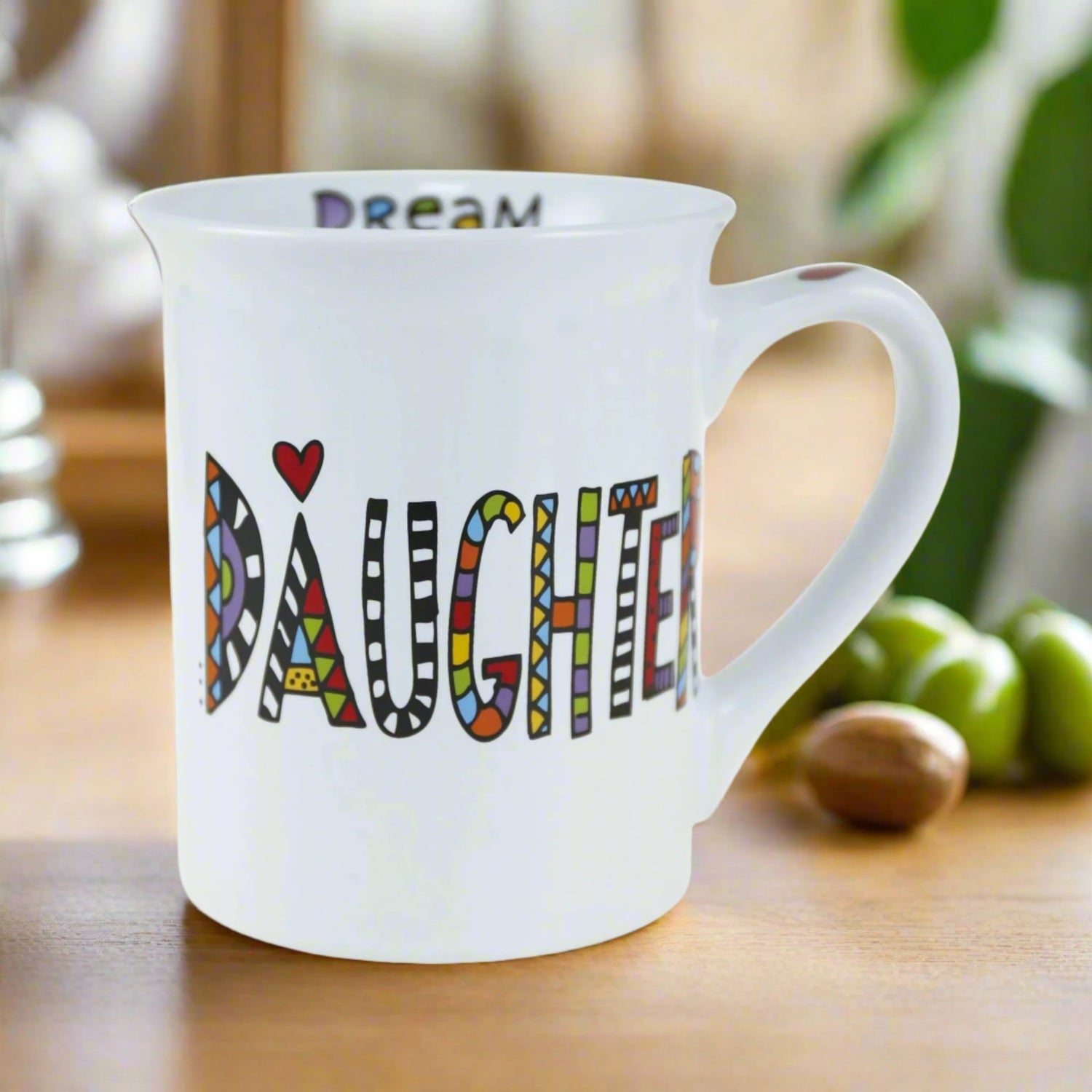This colorful 16 oz mug from the Cuppa Doodles collection celebrates your daughter for who she is with hearts and love. Daughter is written on the mug in a delightful doodle typography while the mug's inner lip dares her to dream big.