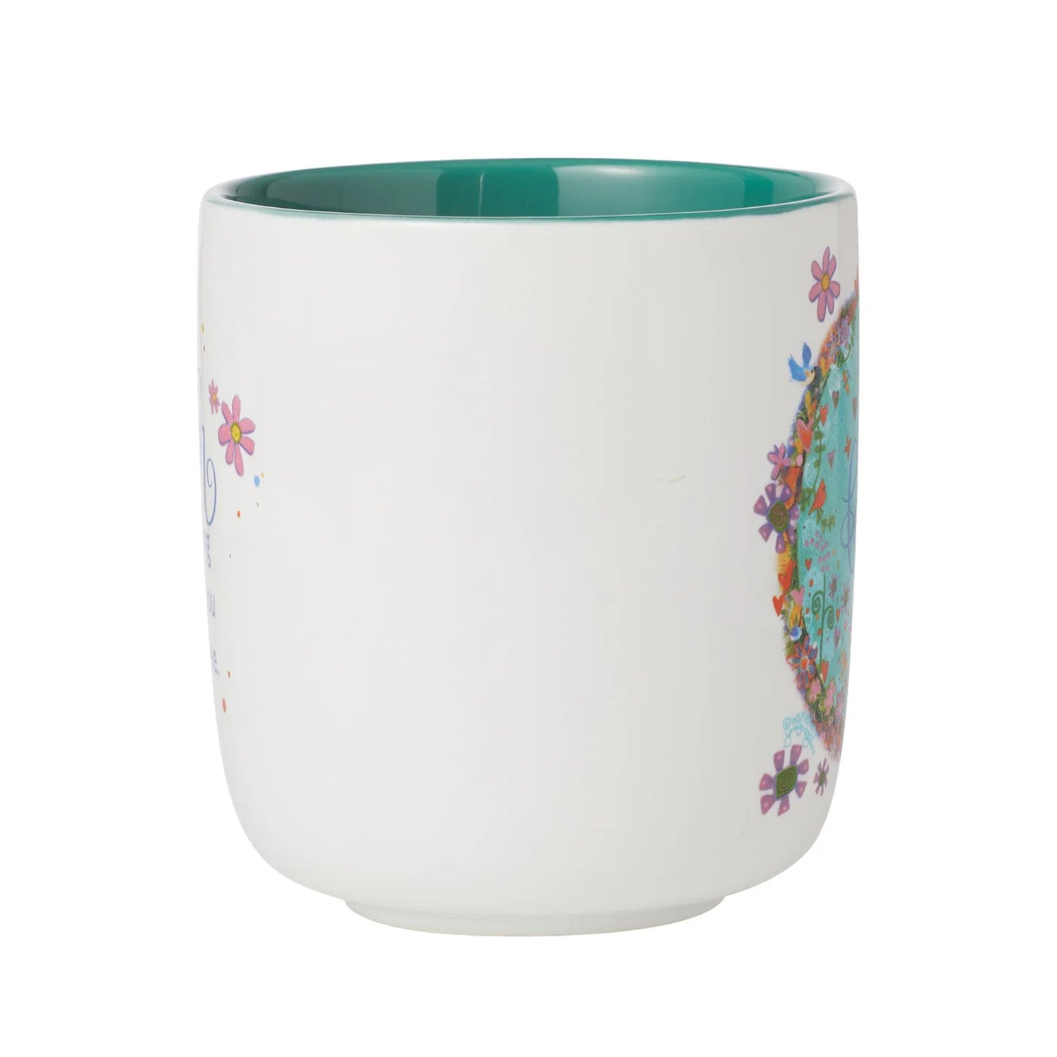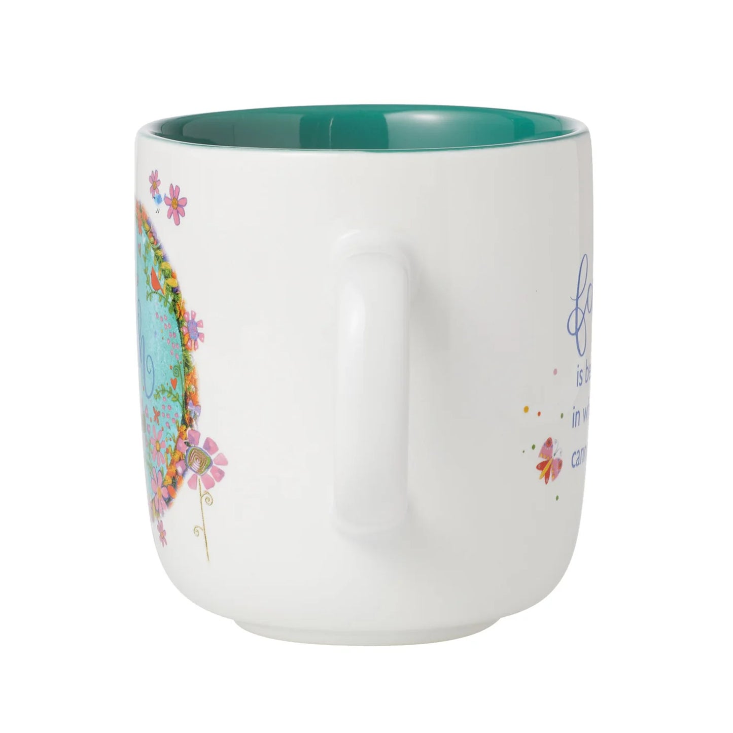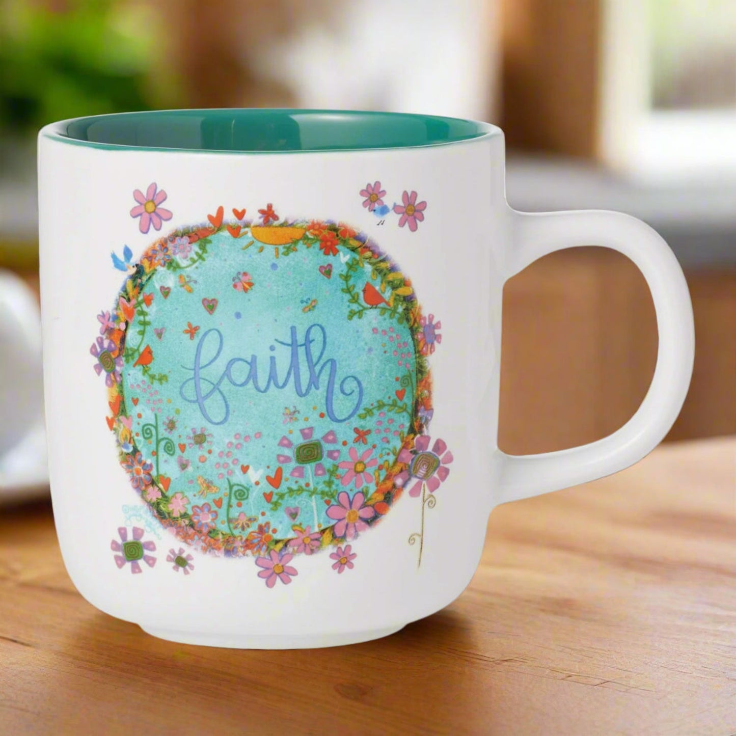 This colorful cup will help you start your morning with a positive perspective and set your mood right for the day. Inside a frenzied frame of flowers, the word faith is written in curly script. A moving quote reminds us to believe.